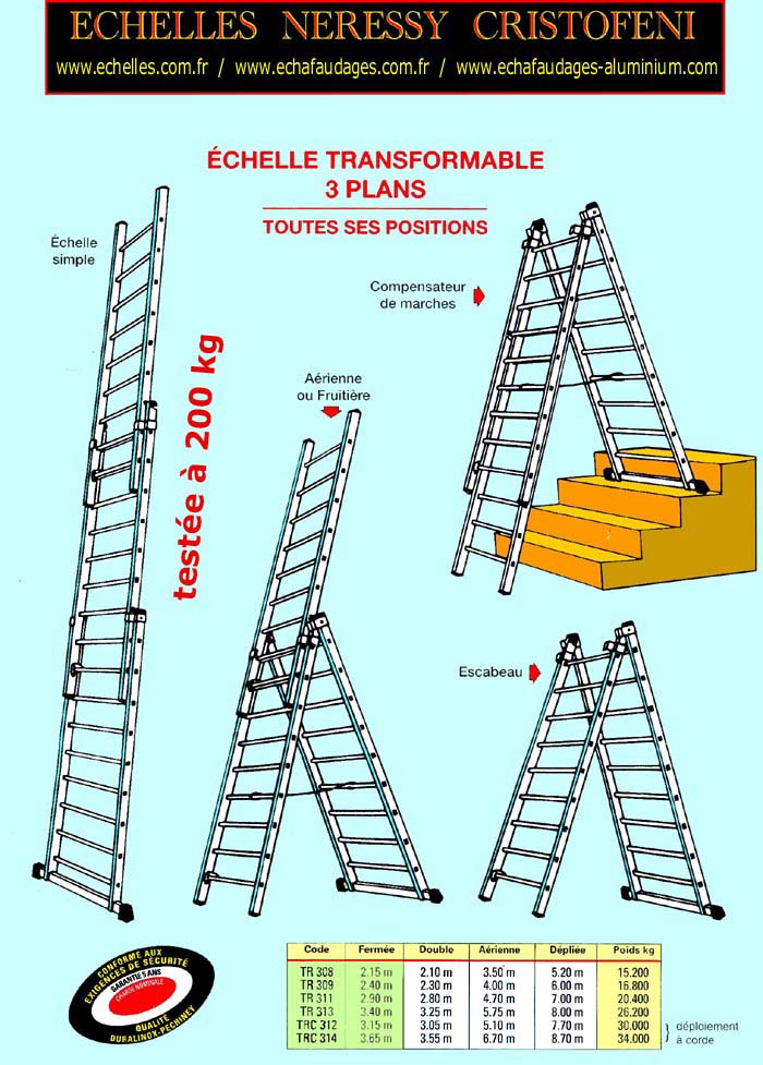 grand échafaudage, prix grand échafaudage, échafaudage 6 métres, prix échafaudage 6 métres, échafaudage 7 métres, prix échafaudage 7 métres, échafaudage 8 metres, prix échafaudage 8 métres, échafaudage alu, échafaudages alu, prix échafaudage alu, prix échafaudahes alu, échaf, prix échaf, prix échaf alu, échafaudge 10 métres, echafaudage 12 métres, travail 6 m, travail 6 métres, travail 8 m, travail 8 métres, travail 10 métres, travail 10 m, travail 12m, travail 12 métres, travail 13 m, travail 13 métres,Prix intéressants pour des échelles de toit, prix échelle de toit en aluminium de 5.30 mètres pour les couvreurs, avec rallonges d' échelle de toit de 1.30 m ou 3 mètre. Pour travailler sur la toiture, vous pouvez acheter une plate-forme cheminée en acier galvanisé. Nous vous proposons des echelles transformables 3 plans 5.20 m, 6 mètres, 7 m, 8 mètres, 7.70 mètres, ou 8.70 m avec une corde de manoeuvre, des échelle transformable 2 plans, échelles coulisses 8.20 mètres, échelles9.20 metres, échelles 10.20 mètre, prix échelles 11.20 mètres, échelle coulisse à cordes 3 plans 9.50 metres, 11.50 m, 11.50 mètres,11.50 metre, 13 mètres. Nos escabeaux ou marchepieds pour les décorateurs, vont du 3 marches,escabeau 4 marches,escabeau 5 marches,escabeau 6 marches, escabeau 7 marche, escabeau 8 marches, escabeau 10 marches et,escabeau 12 marches avec stabilisateurs et bac à outil en alu époxy . Les échafaudages ont en aluminium Normes HD 1004, NFP 93 352, plateau 1 m, 2 mètres, 2.50 metres, les echafaudages alu hauteur travail 6 m, prix échafaudage 7 metres, prix échafaudages 8 mètres. Pour être conforme aux normes, norme PIR, ou PIRL, nous vous proposons les plate-formes de sécurité, tandem, tandems 4 duarib, Tandem 7, tandem 7 pliant , Tandem 10 de marque DUARIB, ou plateforme de securite roulante double acces en alu de la marque HYMER, les gazelles duarib ou tétris de COMABI. Connaissez vous le stabilisateur d'échelle universel pour un travail en toute sécurité et stabilité sur sol accidenté, ou rattrapage de niveau. Les grands échafaudage alu HYMER, en alu ou acier de chez comabi, hauteur travail 8 m, échafaudage 9 metres , échafaudages 10 mètres, échafaudage 11 m, échafaudages 12 mètres, échafaudages 14 metres sont conformes aux normes, et décrêts. Pour les laveurs de vitres, nous vous proposons des prix échelles de laveur de vitre en aluminium. Pour vous aider à travailler avec un écartement du mur, vous trouverez des écarteurs de mur en alu, avec ou sans tablette porte-outil. Pour chaque matériel d'élévation, les prix, Prix sont affichés dans la page prix. Vous pouvez nous demandez un devis pour un prix échelle à crinoline toute hauteur, et vous trouverez sur le site un bon de commande.